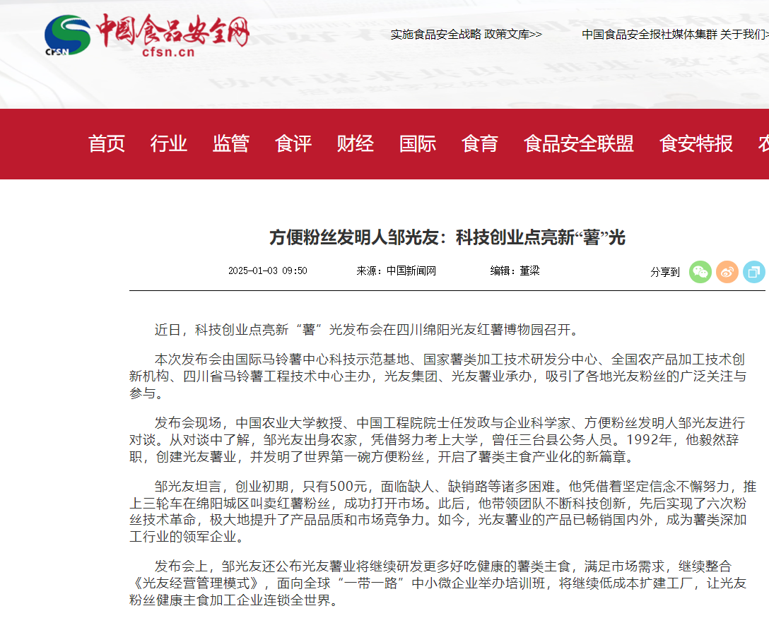 轉(zhuǎn)載中國食品安全網(wǎng)——方便粉絲發(fā)明人鄒光友:科技創(chuàng)業(yè)點亮新“薯”光