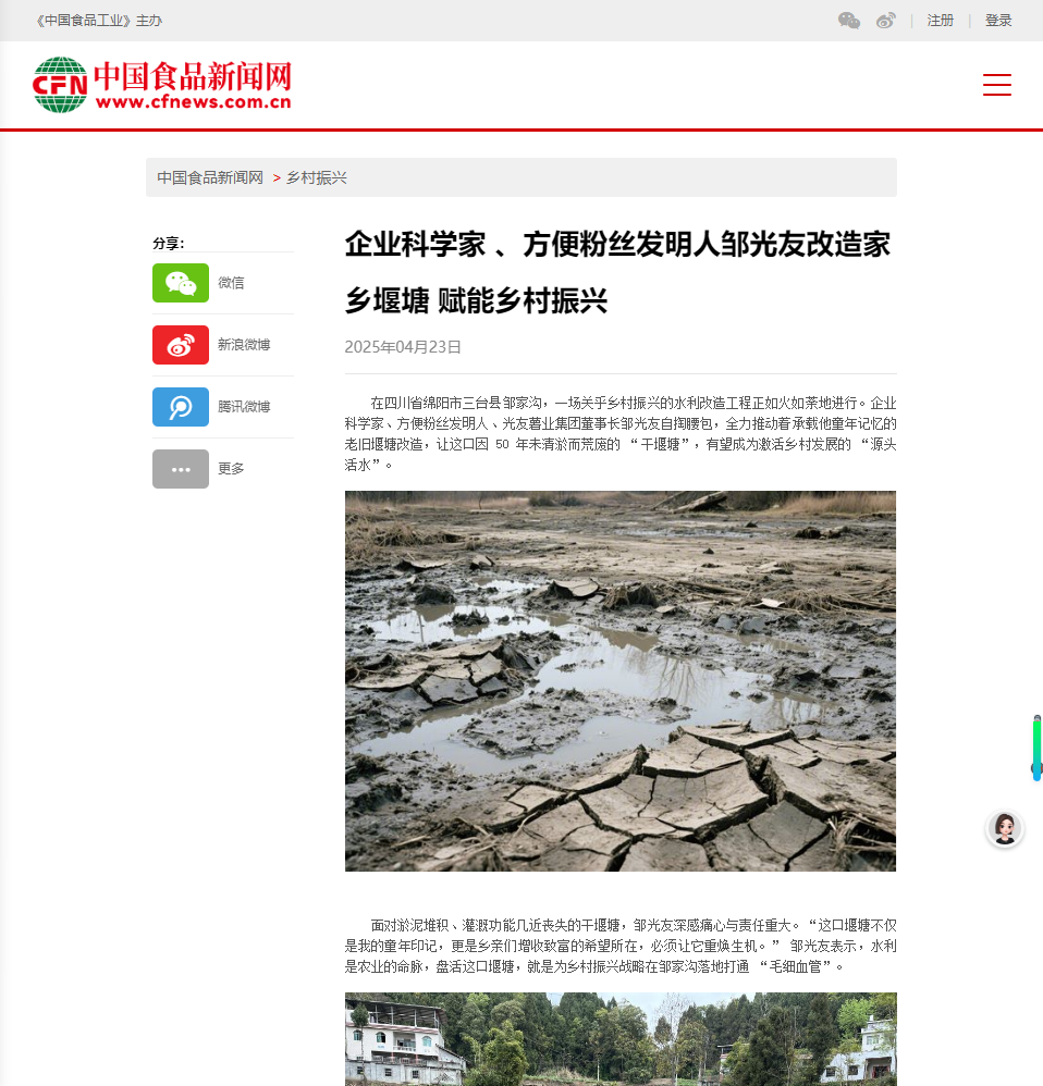 轉載中國食品新聞網(wǎng)——企業(yè)科學家 、方便粉絲發(fā)明人鄒光友改造家鄉(xiāng)堰塘 賦能鄉(xiāng)村振興