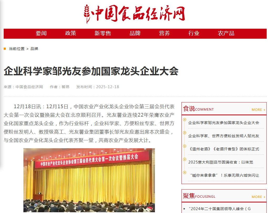 轉載中國食品經濟網-企業(yè)科學家鄒光友出席國家龍頭企業(yè)大會